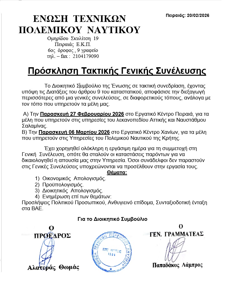 - Επιστολή προς Ν.Τ. και Ομοσπονδίες για διευκόλυνση συνδικαλιστικής δράσης
